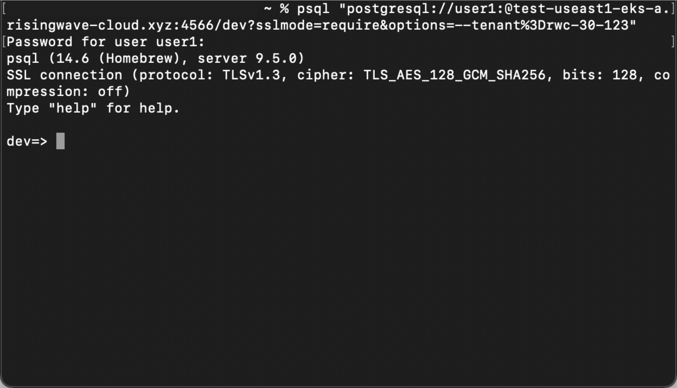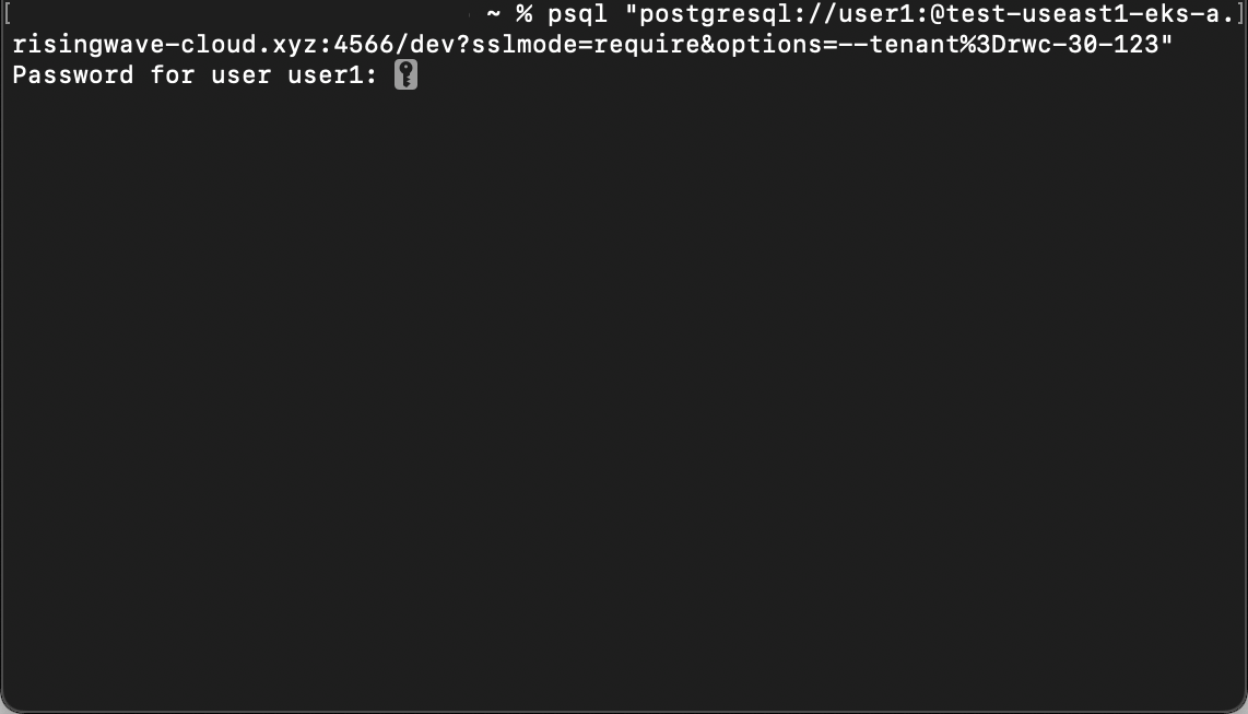 psqlcommand and a generalConnection Stringfor a quick connection. - Alternatively, you can create a new user, RisingWave Cloud offers