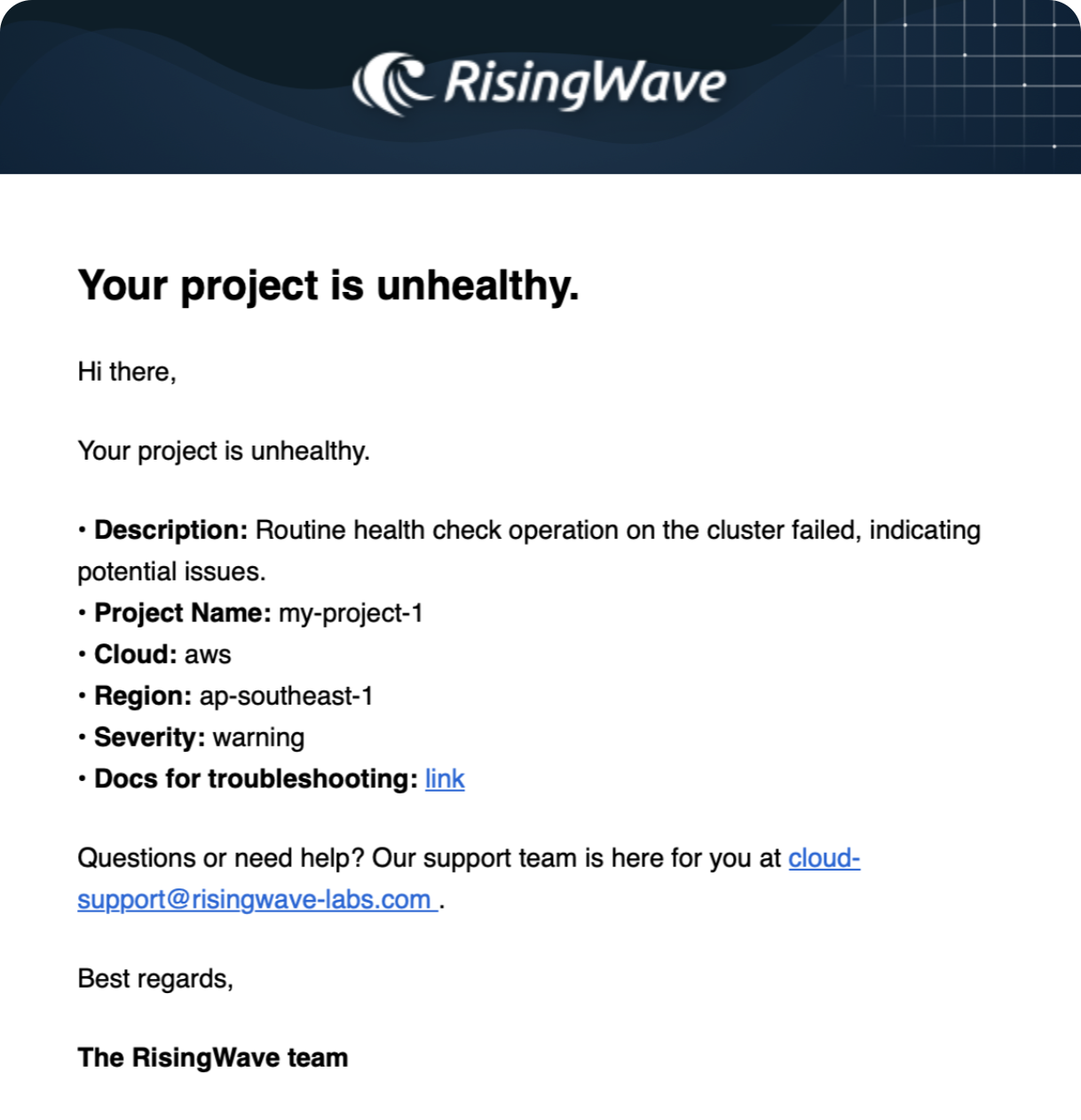 Severity levels Description Example Critical Issues requiring immediate attention to avoid service disruption or data loss. Streaming job failure, node outage. Warning Non-blocking issues that may escalate if unaddressed. High memory usage, compaction delays. Info Informational updates that do not indicate a problem. Customer service contact changed. -