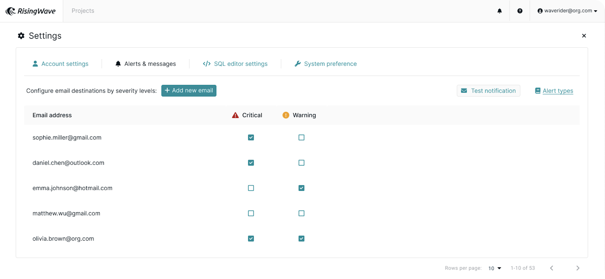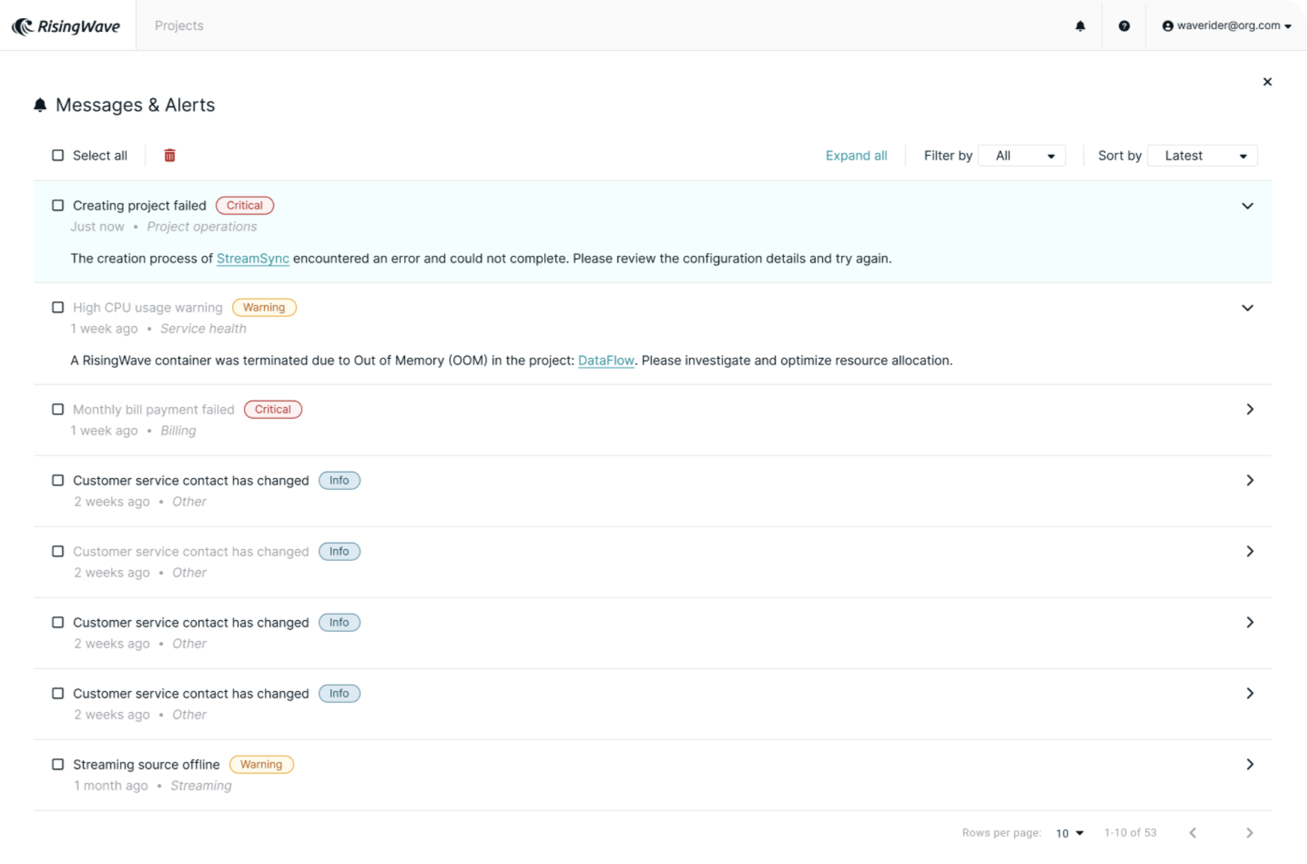 In RisingWave Cloud, click the bell icon in the top-right corner to open the Messages and Alerts list. It allows you to filter notifications for efficient monitoring and issue diagnosis.
