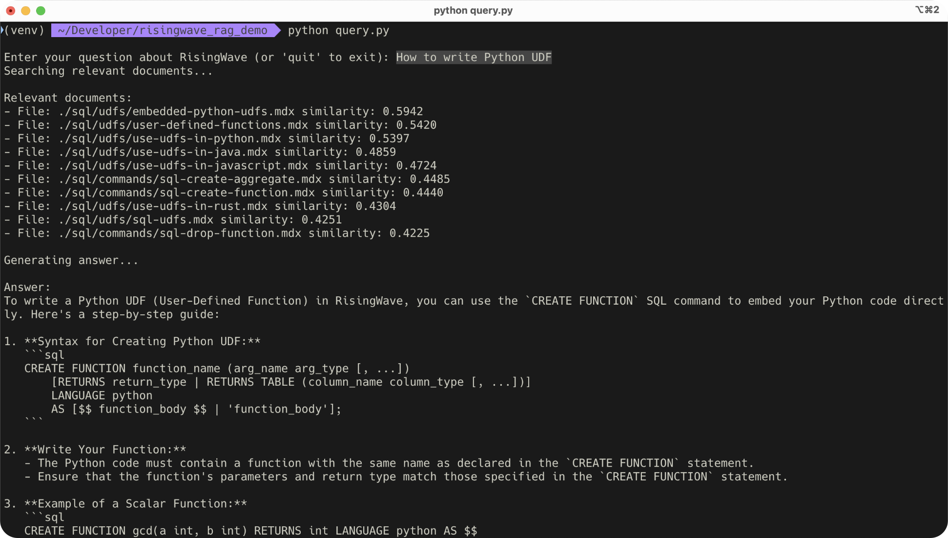 For this demo, we use the documents from the RisingWave docs.Step 3: Query data