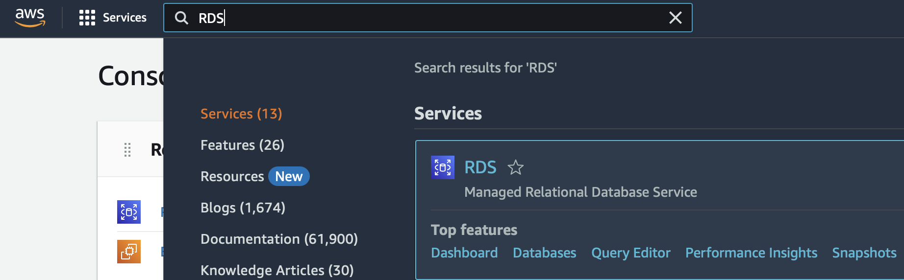 - Log in to the AWS console. Search “RDS” in services and select the RDS panel.