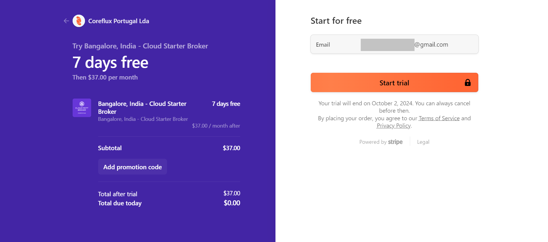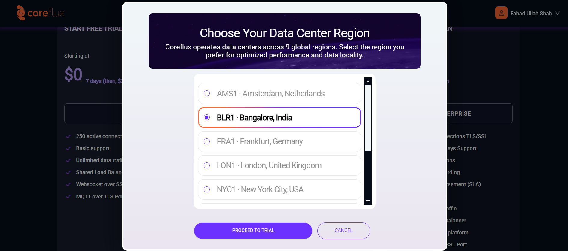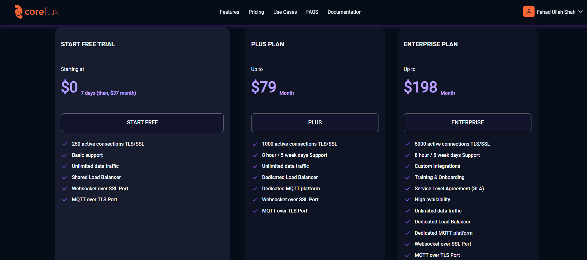 After creating your Coreflux account, you can choose from three plans: FREE TRIAL, PLUS PLAN, and ENTERPRISE PLAN. To set up a free MQTT broker, select FREE TRIAL.