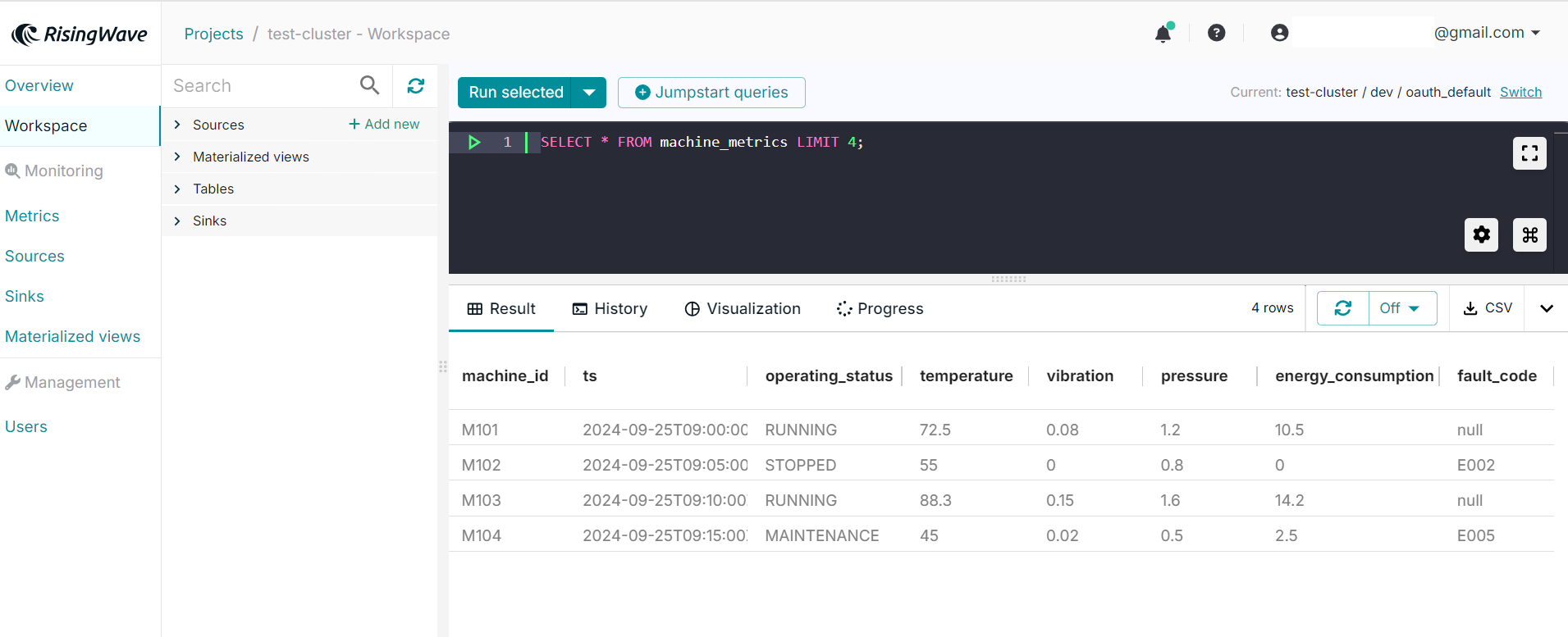 Once you have deployed the RisingWave cluster, create a source in the Workspace using the following SQL query: