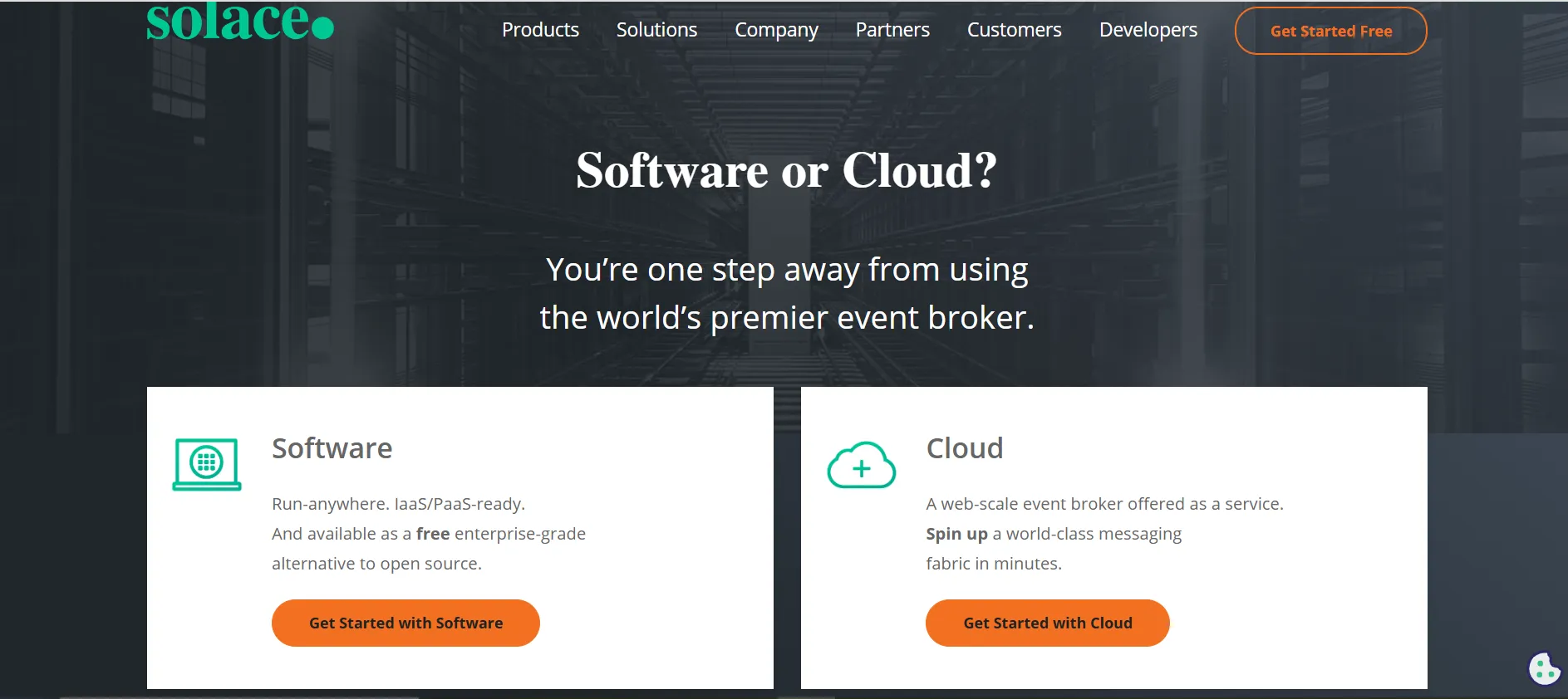 To set up Solace PubSub+ event broker, you can either choose the free Software version using Docker or Solace PubSub+ Cloud.