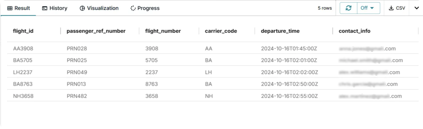 The materialized view can be queried to retrieve the latest data from the source:flight_id, passenger_ref_number, flight_number, carrier_code, departure_time, and contact_info. It highlights passengers with flights departing before 48 from now, indicating that check-in is open.
