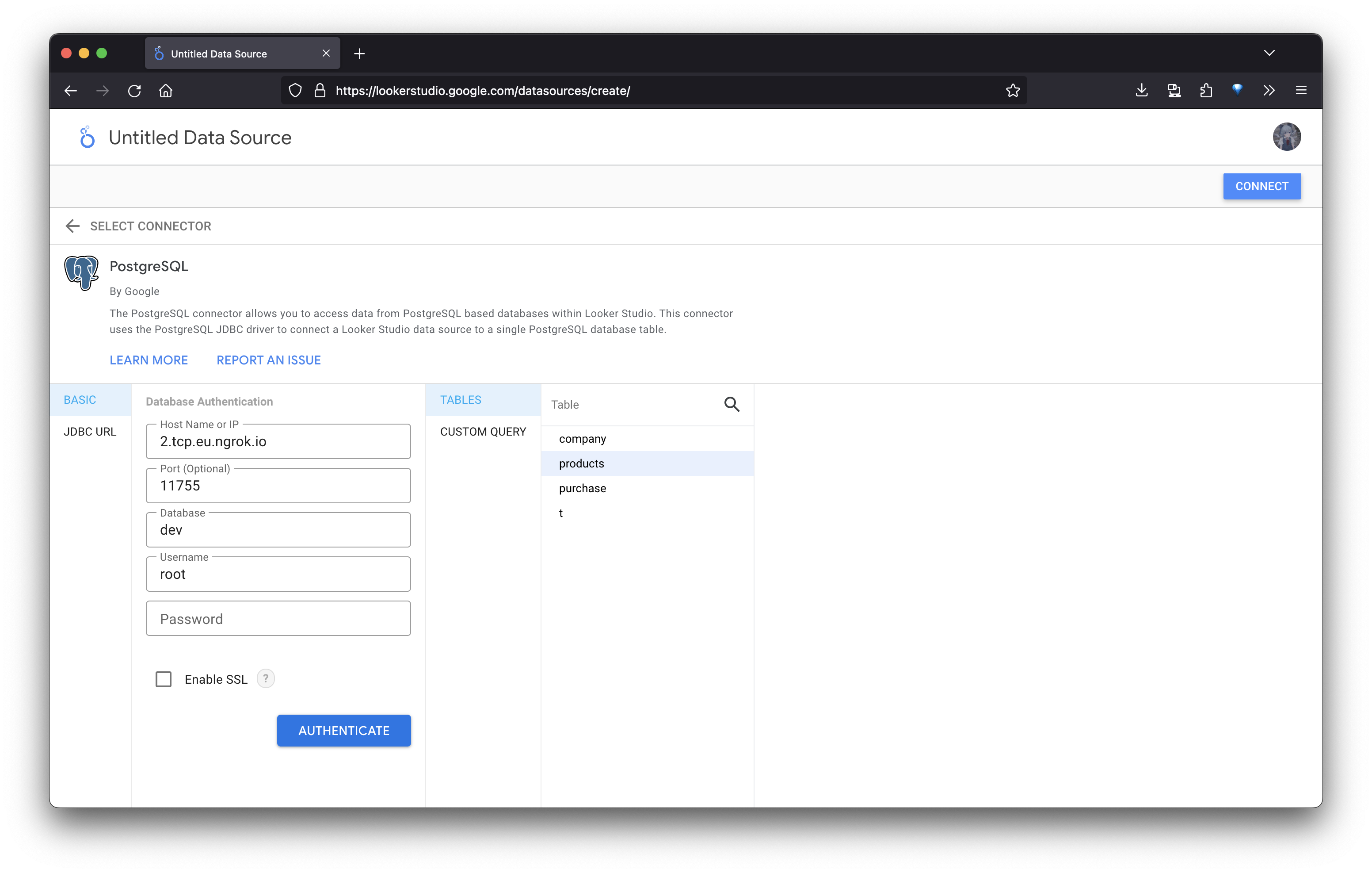 AUTHENTICATEto confirm the connection is successful. - Looker will now have access to the databases and tables in RisingWave. You can select the table you need, or fill in the query manually, then click