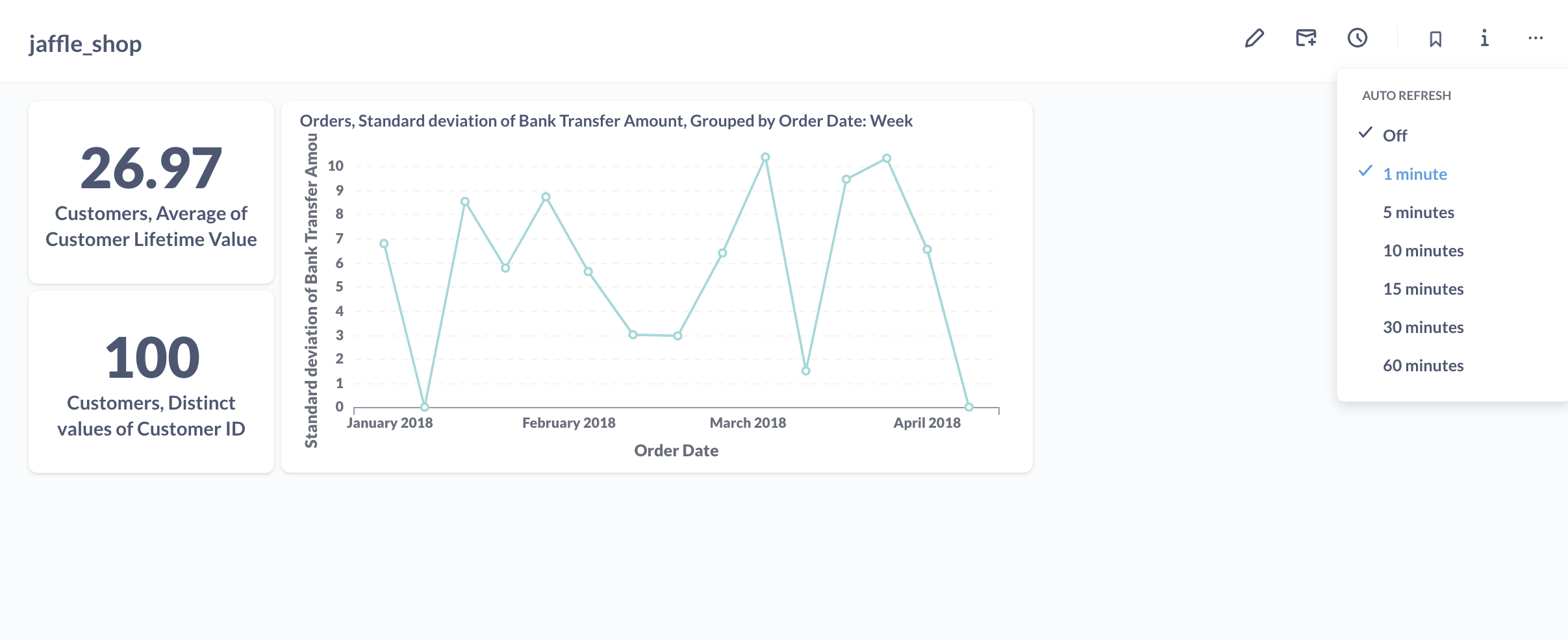 #refresh=5 to the URL, such as http://127.0.0.1:3000/dashboard/1-jaffle-shop#refresh=5, thus setting the refresh interval to 5 seconds.