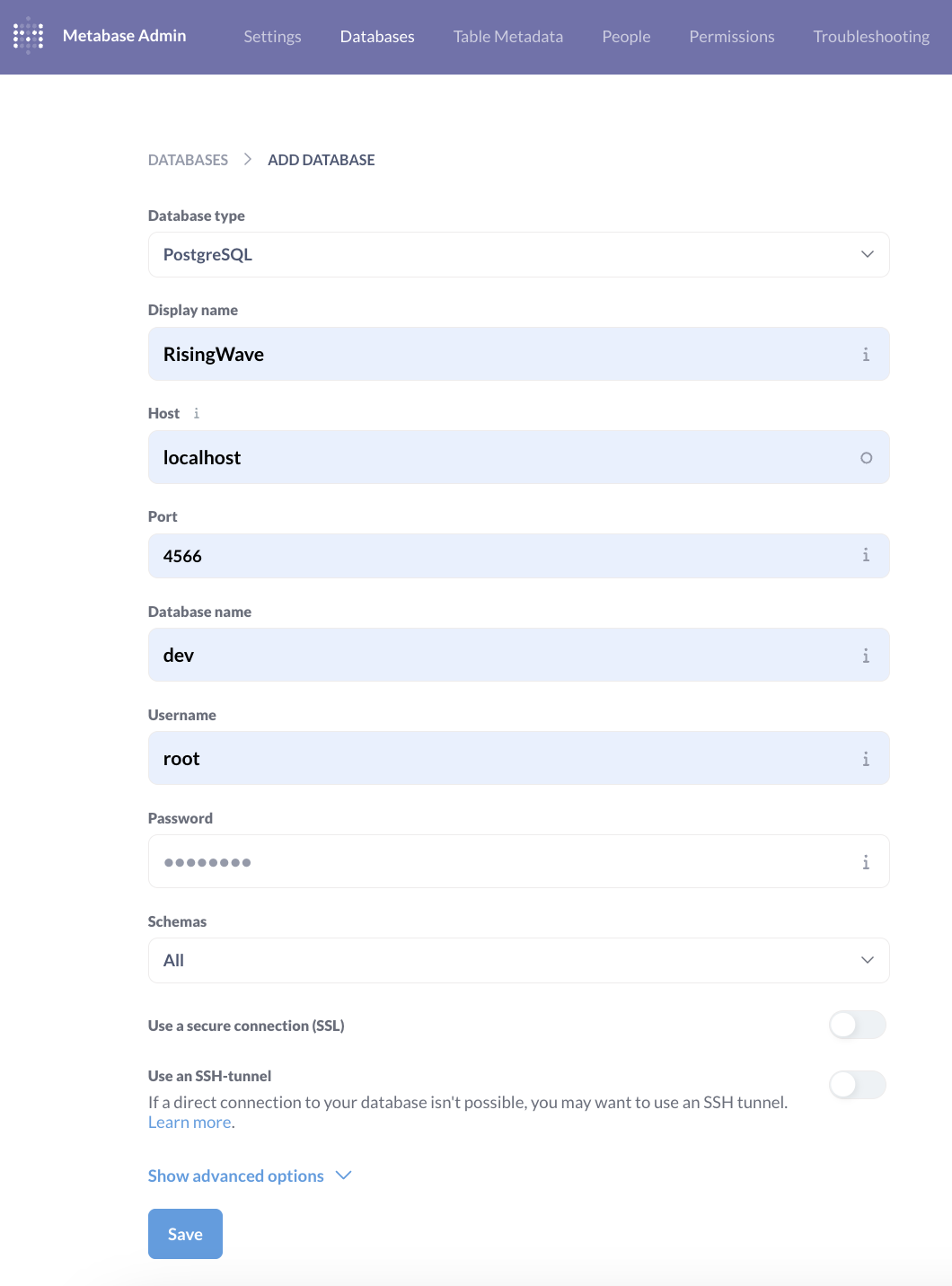 - For the database type, select “PostgreSQL” since RisingWave uses the PostgreSQL wire protocol.