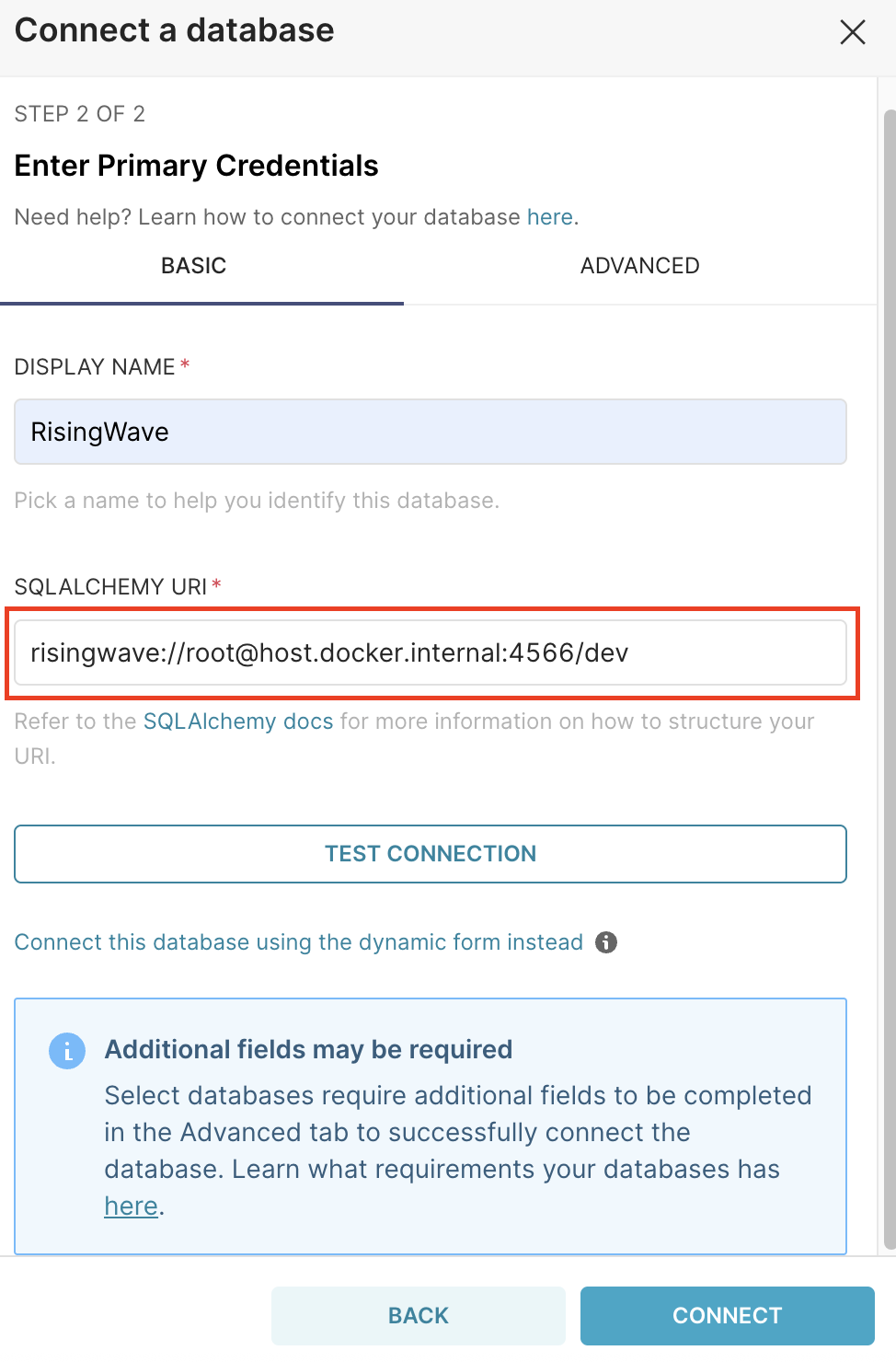 - In the window that pops up, scroll to the bottom and select “Connect this database with a SQLAlchemy URI string instead.”