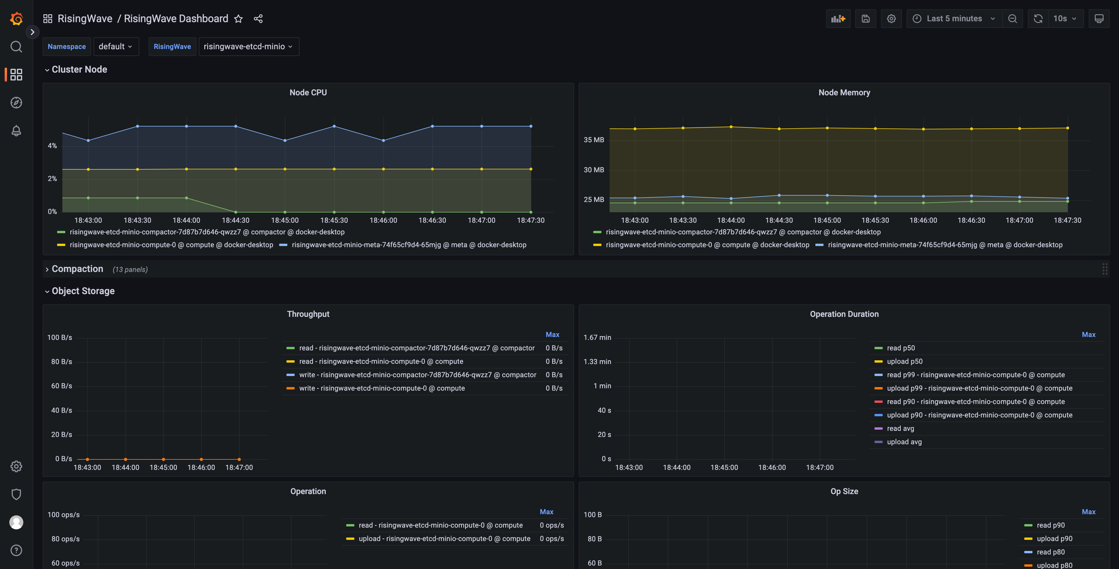 http://<client_address>:3000if you access Grafana from a different host, where<client_address>is the IP address of the machine running the Grafana service. When prompted, enter the default credentials (username:admin; password:prom-operator). - From Dashboards, select RisingWave -> RisingWave Dashboard. You can edit metrics in the dashboard and add new metrics.