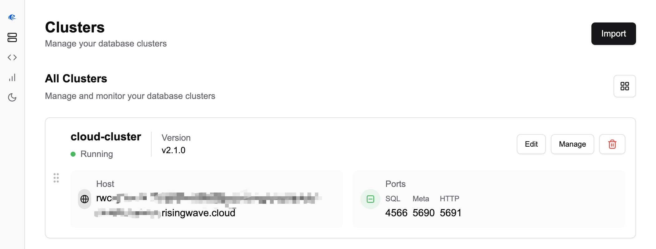 - On the Clusters page, click Import. The Import New Cluster window will open.