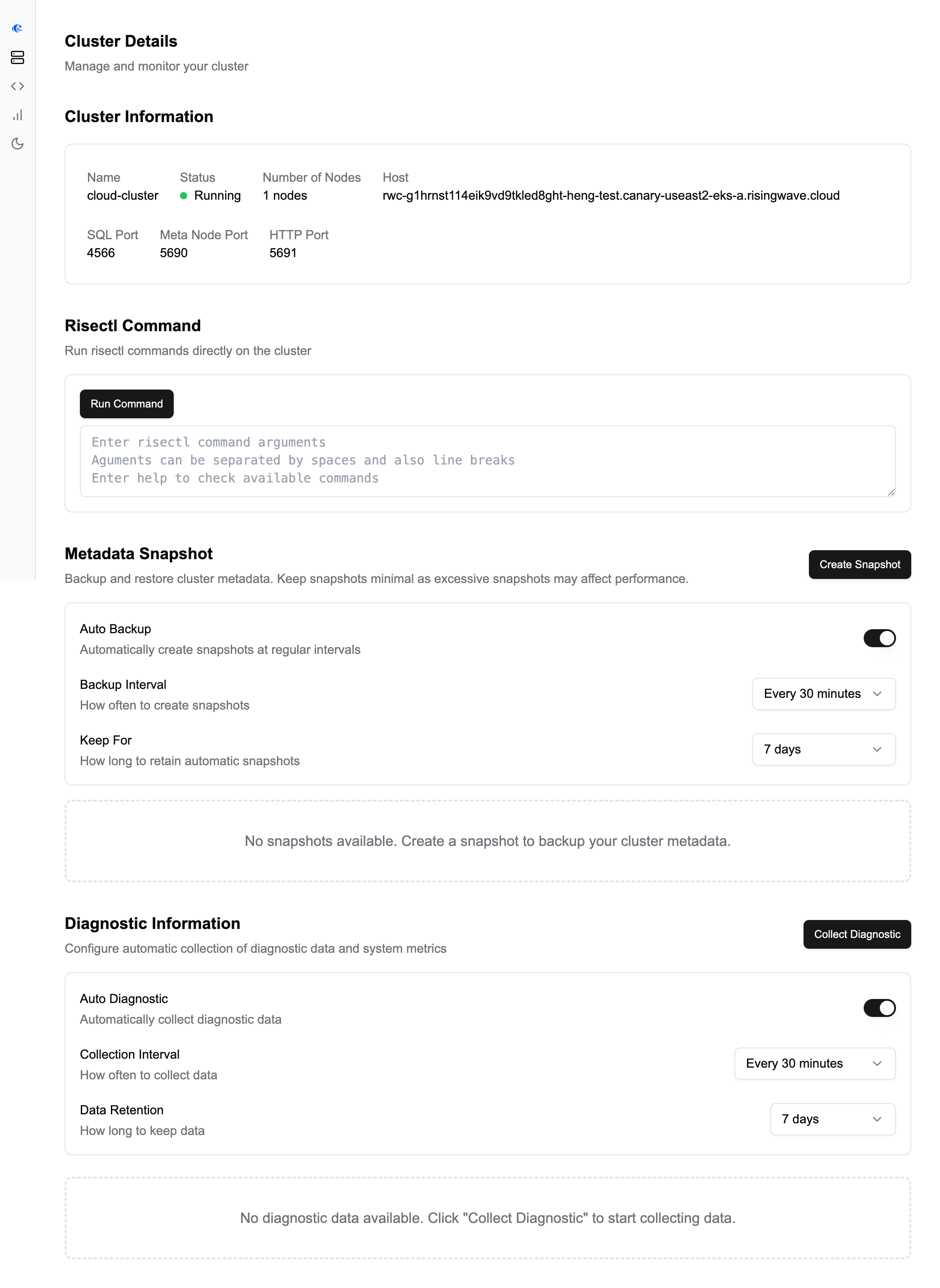For advanced troubleshooting, RisingWave Console can assist in collecting diagnostic data from your RisingWave cluster.- Manual collection: Use the Collect Diagnostic button in the Diagnostic Information section.