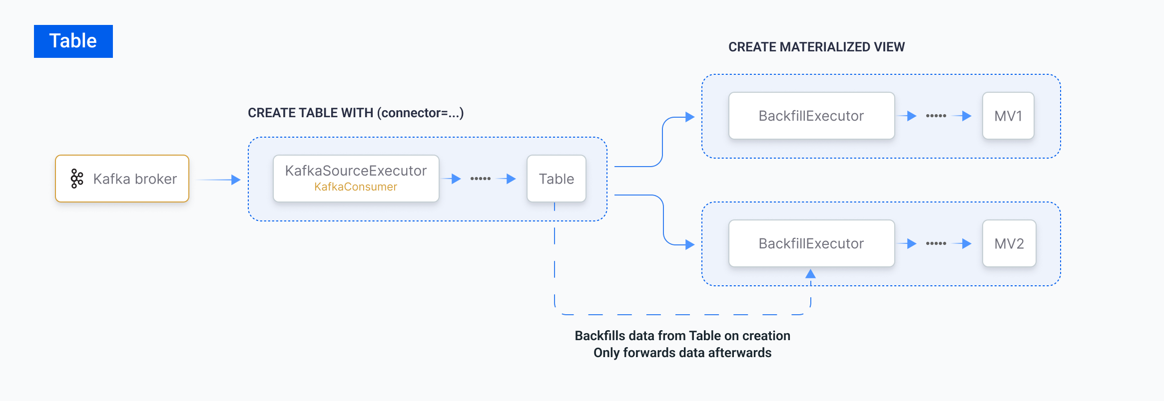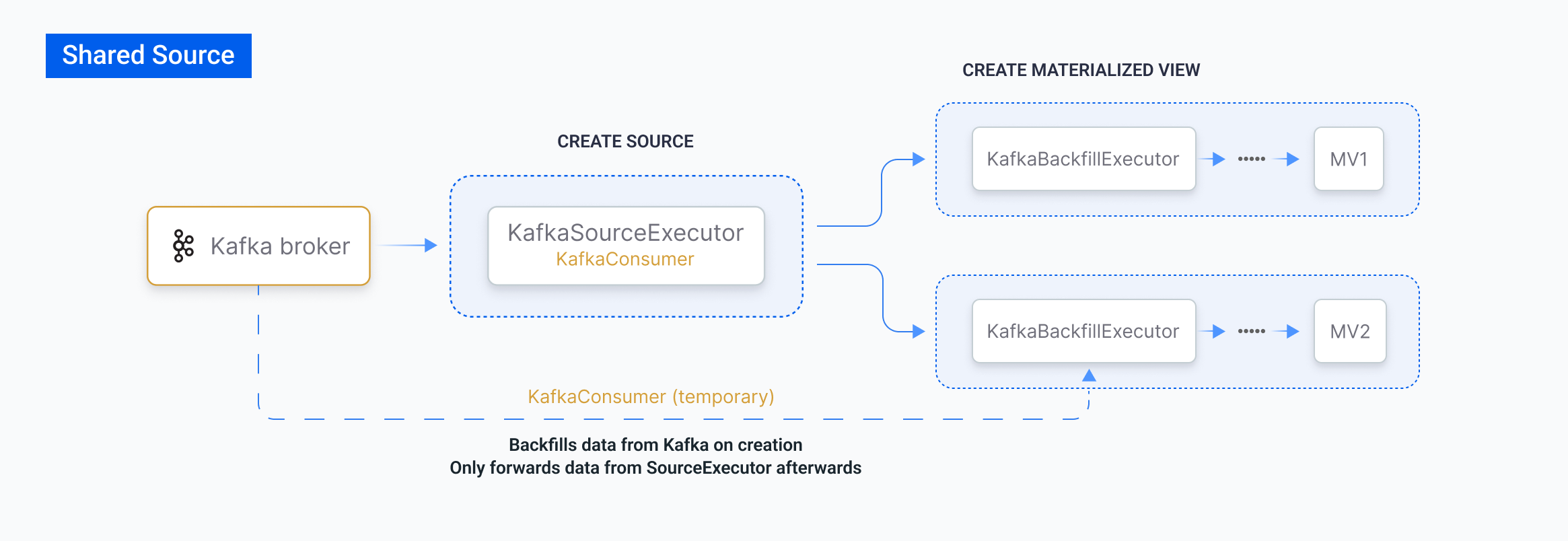 SourceExecutor. - The downstream materialized views will only forwards data from the upstream sources, instead of consuming from Kafka independently.