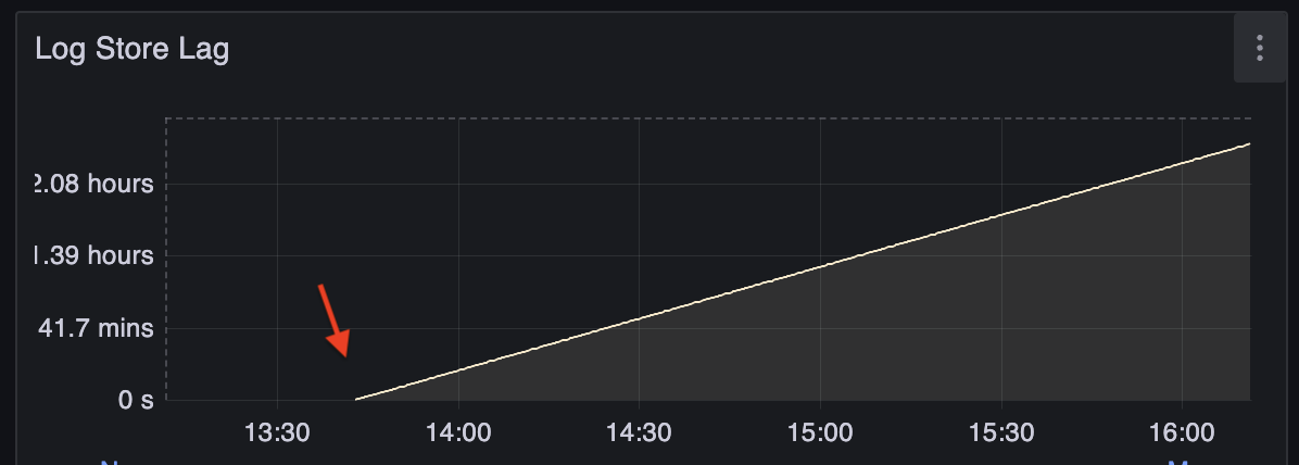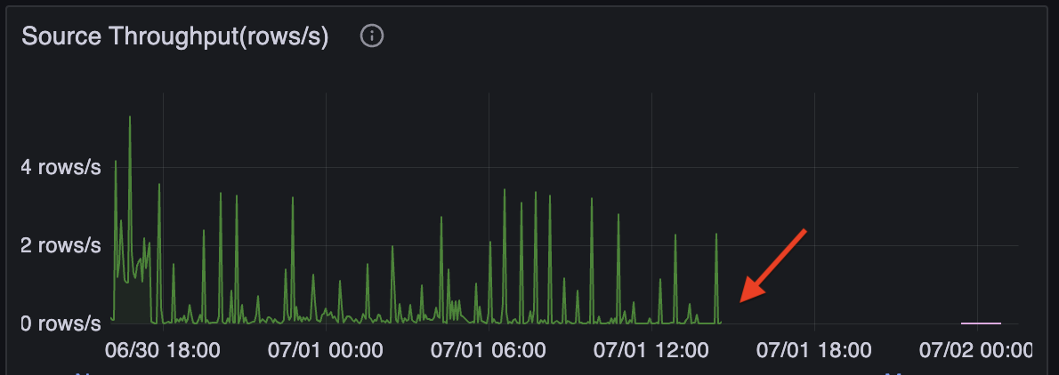 To identify a source problem, navigate to Grafana dashboard (dev) > Streaming section > Source Throughput panel. If the ingestion rate is zero or significantly lower than expected, the source may be the bottleneck. Example of a stuck source: